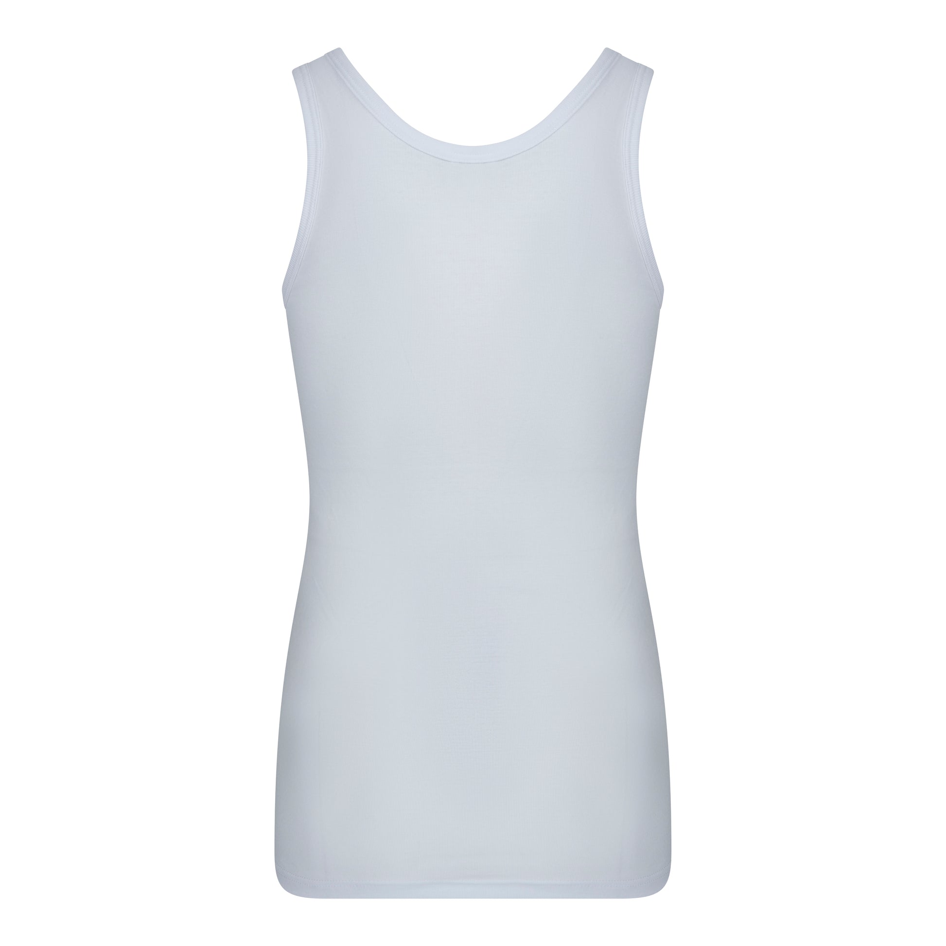 Heren singlet, zonder zijnaden, gemaakt van een fijnrib (100% Katoen). De hals en armsgaten zijn afgezet met boord